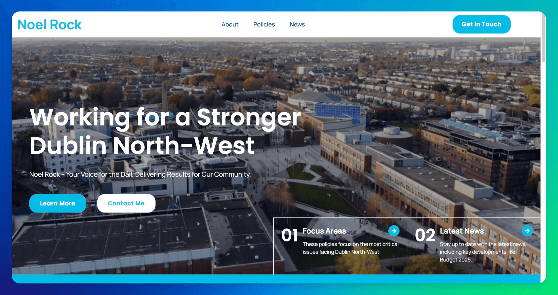The campaign website for Noel Rock was delivered in just four days, leveraging an efficient process to gather essential content and assets. Key information and images were sourced online, including drone footage to highlight Noel’s connection to the local area. We secured a set of 50 icons tailored to his policy points, allowing for future content flexibility. The website copy was carefully crafted to communicate clearly with constituents, alongside a dedicated blog post on Budget 2025 to address relevant economic issues.Additional technical tasks included transferring the domain from Blacknight to Cloudflare for enhanced performance and security, downloading an XML archive of the previous site for reference, and optimizing all images to meet Webflow’s thresholds. We uploaded and hosted video endorsements, such as those from Simon Harris, on YouTube and Vimeo for accessibility across platforms. The end result is a polished, user-friendly site that effectively strengthens Noel’s engagement with his community. The new website enables Noel to effectively disseminate his message, presenting his policies with clarity and making it easier for constituents to stay informed. Through the integrated blog, he can engage his audience with timely updates, such as insights on Budget 2025, while a new newsletter feature allows him to grow his outreach and maintain regular communication. The website also highlights Noel’s background and key milestones, giving his community a comprehensive view of his journey and vision.In addition, we’ve identified potential enhancements to optimize his campaign further, ensuring the platform remains adaptable and can evolve with future needs. This foundation sets Noel up for impactful, ongoing engagement with his constituents.